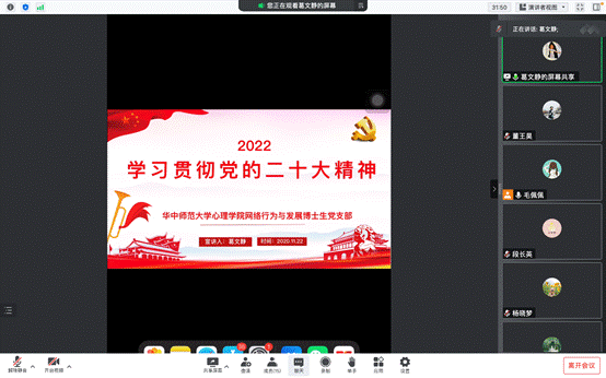 2022年11月22日晚上,结合疫情防控要求,必赢76net线路网络行为与发展博士生党支部采用线上会议的方式开展了11月份主题党日活动。本次活动由葛文静同志领学,网络行为与发展博士党支部全体党员参加了本次党日活动。